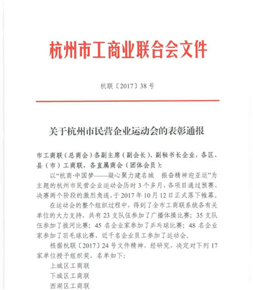 三替集团积极参与以“杭商·中国梦——凝心聚力建名城 振奋精神迎亚运”为主题的杭州市民营企业运动会,在运动会中赛出成绩、赛出友谊、赛出风范,并获得了杭州市工商业联合会授予的组织奖。三替将会再接再厉,积极发挥作用,引导和带动更多的民营企业大力推进企业文化建设,充分发挥文化的凝心聚力作用,为杭州民营经济强市和文化名城建设做贡献。