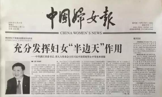 2004年3月3日,时任浙江省委书记、省人大常委会主任习近平就贯彻男女平等基本国策接受《中国妇女报》专访