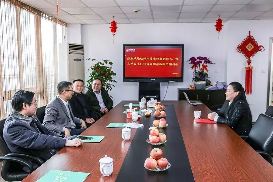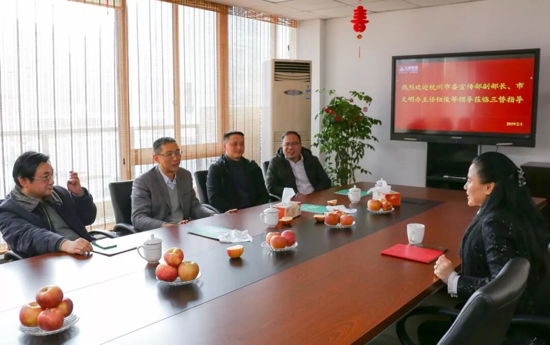2月1日,杭州市委宣传部副部长、市文明办主任钮俊,杭州市委宣传部处长张枫,杭州市西湖区委宣传部副主任张桂元,杭州市西湖区委宣传部科长陈庆,杭州市文新街道党工委委员谢卫青一行赴三替集团总部开展慰问指导工作。钮俊副部长向浙江省道德模范、三替集团董事长陶晓莺表示节日的慰问,并进行座谈交流。