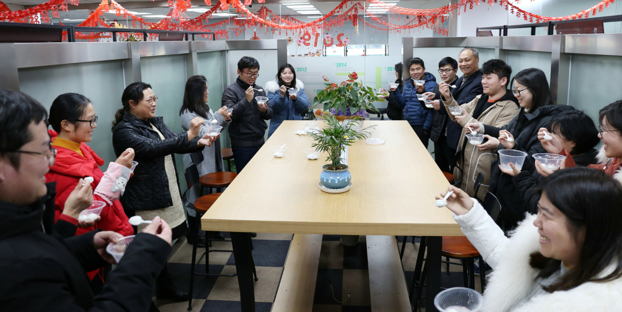 不一会,党工委主任张建平端着汤圆出现了。他把一碗碗汤圆送到每一位员工的手上,并祝福大家身体健康、万事如意。